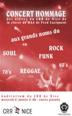 19 janvier 2009La classe de Musiques actuelles de Fred Luzignant au CRR de Nice est heureuse de vous inviter à son concert-hommage aux grands noms du Rock, de la Soul, du Funk et du Reggae : Mercredi 21 janvier à 18h