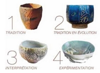 Face à cet héritage et ces mutations rapides, 4 attitudes résument les tendances actuelles retenues par les céramistes : La centaine d’artistes invités créeront chacun une série de dix bols, tous différents mais réalisés avec une seule technique. L’intérêt de chaque série de dix bols sera de montrer toutes les variations possibles de formes, de textures, de couleurs, d’ornements, que permet un seul choix technique et une seule approche.
