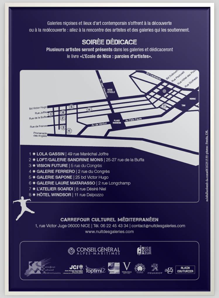 Véritable événement dans le monde de l’art contemporain, la Nuit des Galeries s’est imposée depuis 10 ans et occupe une place privilégiée dans l’animation et la promotion des lieux artistiques niçois auprès du grand public. Déclinaison de "nuit blanche" à la niçoise, venez profiter de l’ouverture exceptionnelle de lieux d’art en dehors des horaires conventionnels et découvrir œuvres et artistes sous un jour nouveau et festif !