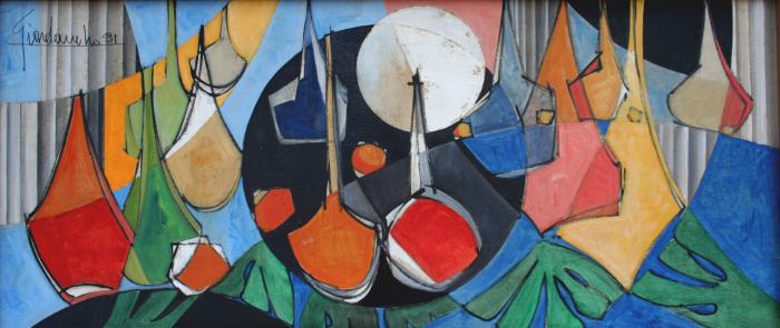 Ainsi, les objets usuels – vases, pots, marmites, tasses, lampes- sont placés dans un environnement où s’entrecroisent courbes et formes rectangulaires, limité par des aplats de couleurs primaires qui découpent le fond. Les natures mortes, assez singulières ou les paysages sont des prétextes à la composition. La recherche de l’harmonie est doublée d’habiles structures de couleur d’une palette sobre, témoignant de son souci majeur de la géométrisation et de l’édification du tableau. Les lignes et champs de forces retranscrivent l’interaction des objets avec leur espace.