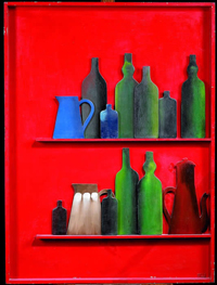 Claude GILLI né en 1938. L’esprit des bouteilles, 1965. Peinture sur bois découpé. Pièce unique. Signée en bas à droite. Titrée, datée et contresignée au dos. 120 x 90 cm.