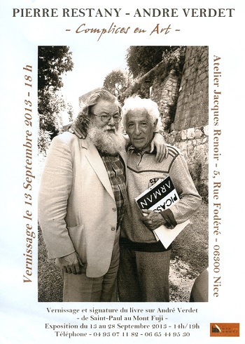 Du plus humble des artistes au plus célèbre, il avait la même intensité émotive en faisant la description de l’œuvre. Jean Giono avait encouragé les débuts de notre Verdet dans le monde de la poésie. Jean Cocteau voyait en lui un frère en poésie. Pierre Restany, le fondateur du « Nouveau Réalisme » avait une affection particulière pour Verdet, c’était son « frère d’armes ». Le rôle de Verdet au sein de la fameuse « Ecole de Nice » fut exemplaire, de nombreux écrits en témoignent et plus particulièrement pour ses amis Arman et Yves Klein. André Verdet fut aussi un résistant de la plus haute impor¬tance, d’un engagement total. Rescapé des camps de la mort d’Auschwitz et Buchenwald, il a toujours défendu nos libertés, humaines et artistiques.