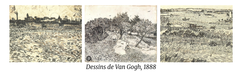 Pour van Gogh, qui peint ses œuvres face au paysage, le motif n’est jamais qu’un point de départ, un appui fragile sur lequel il tente de construire. Ses toiles ne représentent pas : elles recréent à partir de la réalité, mais aussi de la mémoire. « On croit que j’imagine, dit-il, ce n’est pas vrai, je me souviens. » Chaque tableau devient ainsi un assemblage de formes déjà vues, de sentiments déjà vécus. Dans ce qui attire son regard, il y a toujours la trace d’un souvenir, une réminiscence.