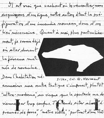 « Première affectivité accordée aux regard lyriques et derniers moments de lucidité de notre forêt de conscience », y écrit-il (…) L’île aussi passe lentement de la mer à la plaine solaire par groupe d’animaux ordonnés et placides. Le grand dieu Ariam est là qui surveille d’un œil morose La (sic) vaste migration silencieuse. Ainsi, nous entourer de réponses quotidiennes dans lesquelles nous pouvons lire les ricanements du songeur mis à feu, et les éclats de rire du Nomade. Il est vrai que sachant où les rencontrer, nous acquiescions d’un signe, notre action étant la préfiguration d’un incendie nouveau, donc d’un « bien » nécessaire. (…) car le langage qu’est-il pour vous : un simple moyen de vous rapprocher intellectuellement de la griserie du plongeur sous-marin, du sifflement d’une paire d’ailes dans la nuit calme ? »