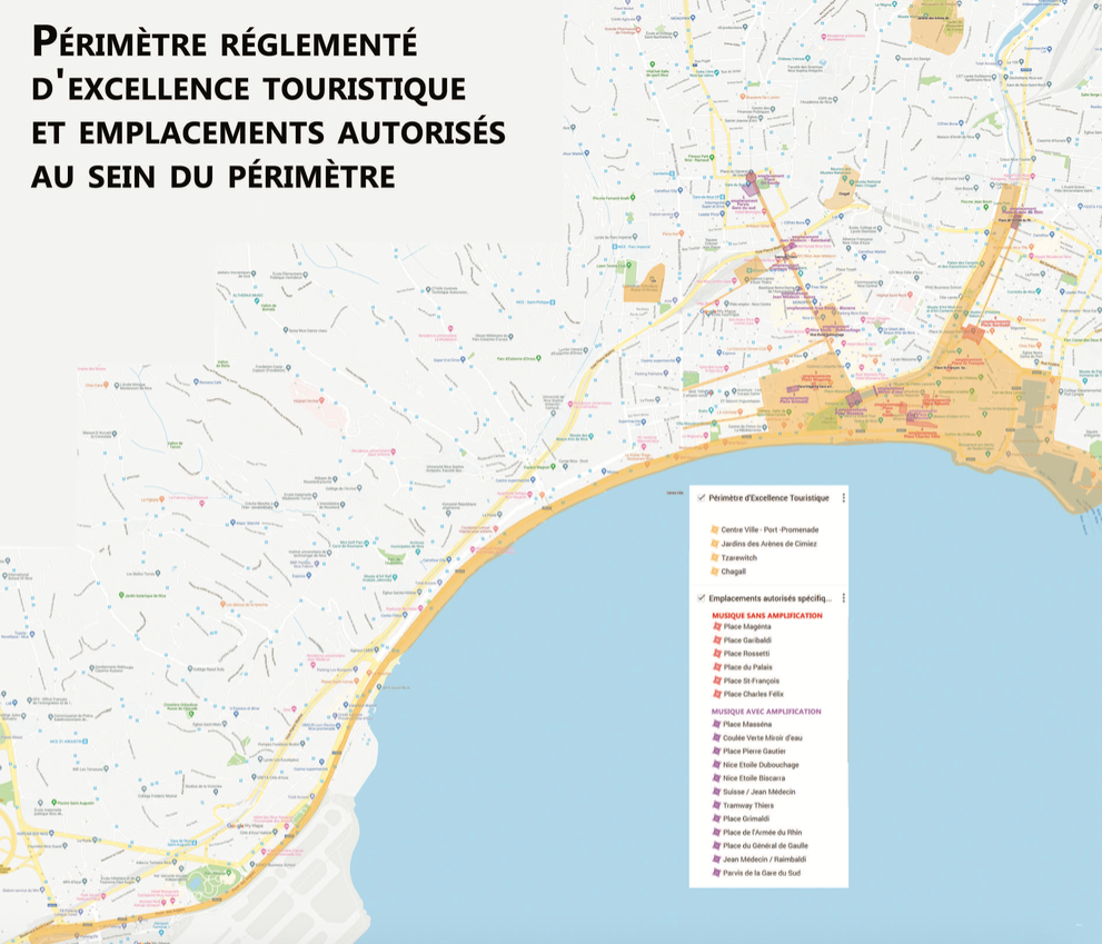 Le périmètre d’excellence touristique couvre principalement l’ensemble du centre-ville et de la Promenade des Anglais. Dans ce périmètre, 18 espaces autorisés peuvent accueillir les artistes de rue. La localisation de ces espaces est à retrouver en pièce jointe. Il est possible de se produire en dehors de ce périmètre d’excellence touristique, sans besoin d’une autorisation municipale et sans inscription, mais uniquement en mode ambulatoire et dans le respect de l’ordre public.