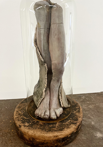 On retrouve ses pieds parfaitement sculptés (des genoux aux orteils) cette fois-ci debout et posés sur une pièce sphérique de vieux bois et mis sous une cloche de verre (comme les pendules d’antan). Ils sont vaguement recouverts d’un tissu (le bas d’un suaire probablement).