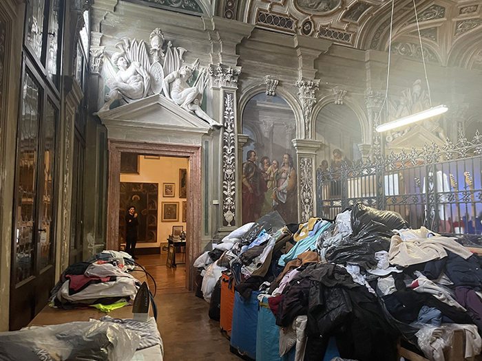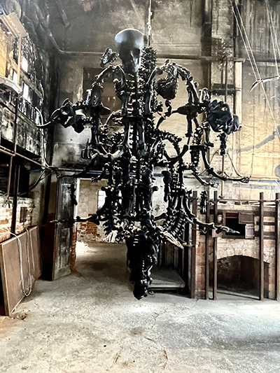 Christoph Büchel a réalisé une gigantesque installation envahissant un immense palais du Grand Canal, juste en face de celui de Pinault. Il a reconstitué avec les moyens de Prada un mont de piété entassant un nombre incroyable d’objets de toutes sortes au delà du vraisemblable. Il a dû vider plusieurs dépôts d’objets périmés alentours pour arriver à remplir ce palais dont on peut voir de beaux restes : fresques, sculptures, portes, escalier d’apparat, sorties sur les canaux.