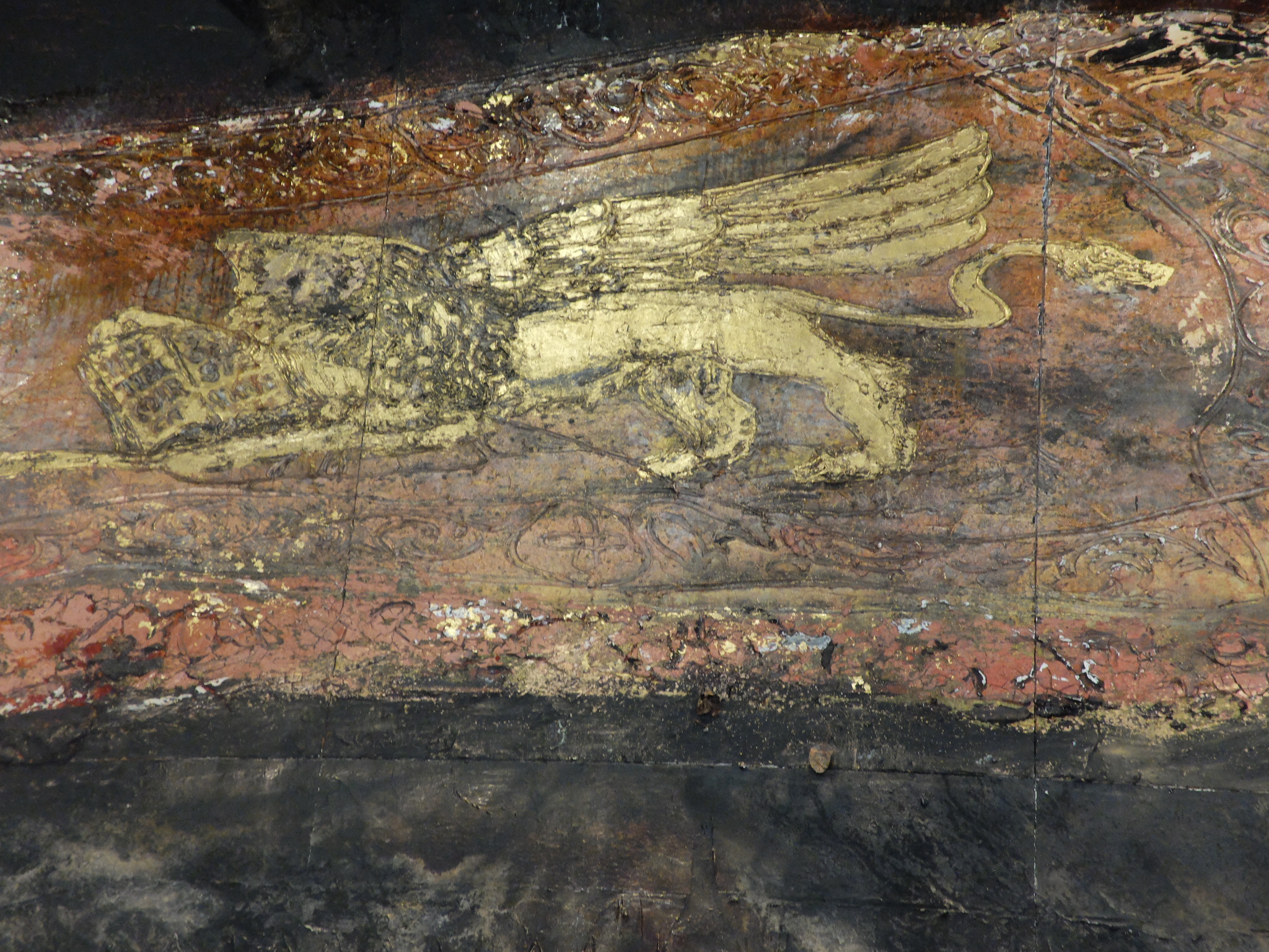 Sur le mur d’entrée, encadré par deux anges dorés et noircis, un champ dévasté au milieu duquel une échelle mal en point tente de grimper. Si c’est « L’Échelle de Jacob », elle aura du mal à rejoindre le ciel car elle est très usée et composée de parties d’échelles mal fixées entre elles. Cette échelle a probablement dû être utilisée pendant des années par l’artiste qui semble l’avoir abandonnée là, fixée (immortalisée ?) sur sa toile.