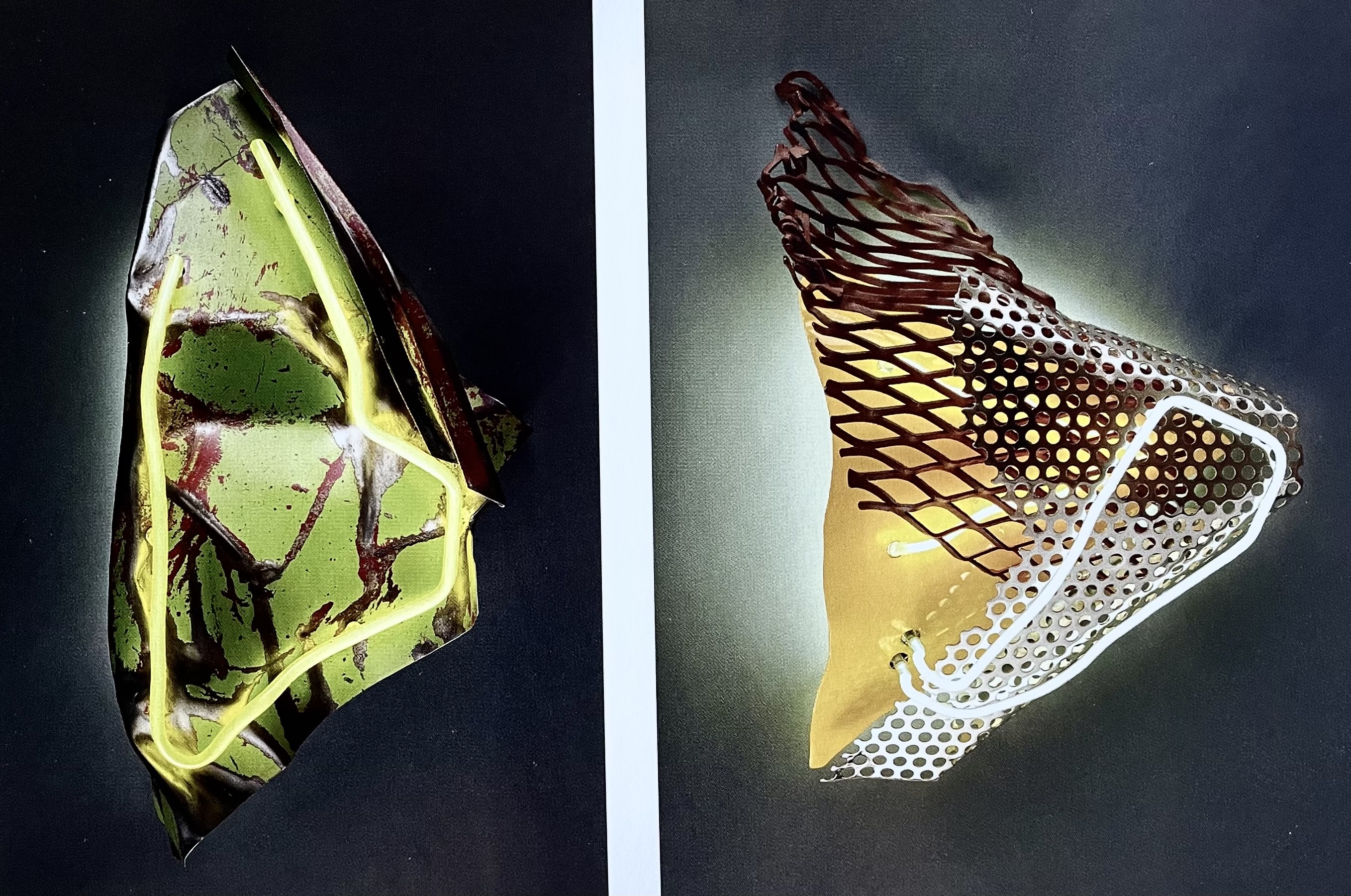 IPN, tôles rouillées, froissées, chromées, aluminium, plexi, grillages et différents métaux sont confrontés par le sculpteur à la lumière de néons ou de leds qui viennent souligner ou contredire les formes, voire les enchevêtrer, ou les entourer afin de les mettre en valeur.