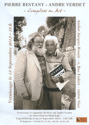 André Verdet est né le 4 août 1913, mais faire coïncider le centenaire de sa naissance avec une Journée du Patrimoine était une très bonne idée, sa personne et son œuvre faisant aujourd’hui vraiment partie des « biens culturels » des Alpes-Maritimes et de la France. Les festivités autour de ses cent ans ont donc commencé le vendredi 13 septembre à l’Atelier Jacques Renoir (Nice) avec l’exposition de photos de Frédéric Altmann intitulée « Pierre Restany-André Verdet, complices en art », qui donnait à voir entre autres des clichés d’André Verdet avec Pierre Restany, Arman, Nivèse, Kijno, Ben etc., ou André Verdet seul, en kimono, au mont Fuji…