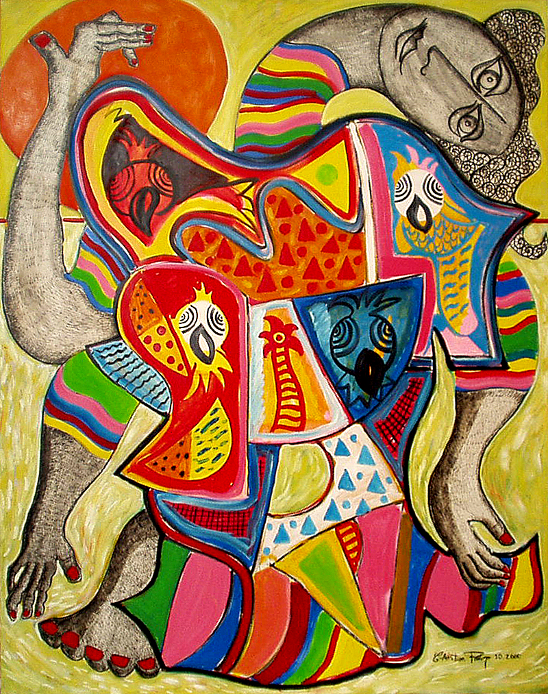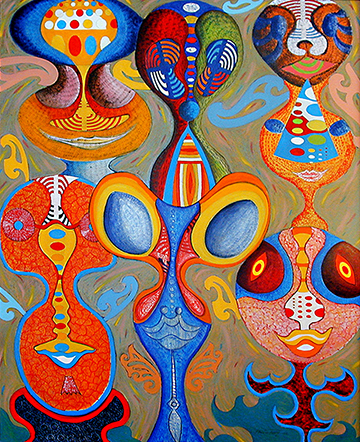 Sous une abondance de formes enserrant des couleurs se dissimulent des personnages qui n’apparaissent que dans un deuxième temps, quand l’œil s’est habitué à l’exubérance.