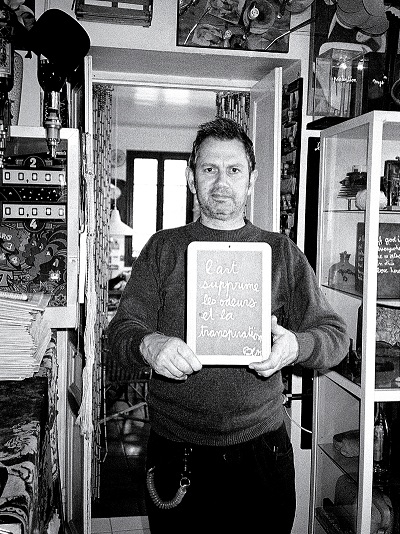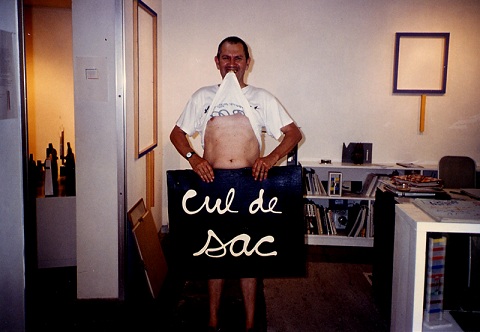 En 1999, de lui j’ai écrit : « Nous eûmes des relations ponctuelles, chargées de méfiance, mais loyales. L’homme capable de mener de front à Paris dix expositions à la fois, ne pouvait s’attarder dans une galerie qui, irrésistiblement, virait mal : vers la PEINTURE ! abstraite ou figurale, vers une recherche du sens, une purification de la peinture, vers une rupture avec la dominante Nomenklatura, avec un retour voulu au primat de la forme. Lorsque je lui fis sa première exposition dans une galerie, je m’amusais beaucoup, m’instruisais sur Fluxus, prenais distance avec une certaine idée des avant-gardes autoproclamées, que je trouvais déjà obsolètes. Il fut avec enthousiasme de toutes les expositions « Ecole de Nice » dont, il faut bien le dire il fut le chantre, la pasionaria, et, plus qu’aucun autre, le hérault. Et, disent les mauvaises langues, peut-être même aussi, un peu Dame Pipi… » (Alexandre de la Salle)