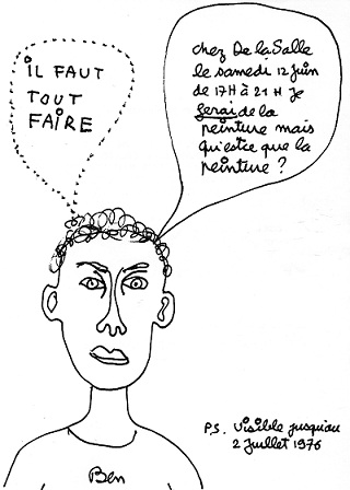 Son texte de l’invitation-dépliant est croustillant : « Cher camarade. Nous ne pouvons pas laisser passer sans réagir l’exposition de Ben chez de la Salle. Ben n’est plus aujourd’hui un créateur, mais un fabricant de produit de consommation pour la bourgeoisie dominante.
