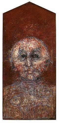 Alexandre de la Salle – Pour parler des débuts de ma galerie Place Godeau à Vence à partir de 1960, j’ai évidemment évoqué Gérard Eppelé, (Chapitre 3, Parts I, II, III) un immense peintre que j’ai beaucoup fréquenté à l’époque, et exposé, et je reviens à lui aujourd’hui car la municipalité de Gorbio, en la personne de son maire Michel Isnard, l’expose au très beau château transformé en Centre Culturel, dans la Tour Lascaris, jusqu’au 7 octobre 2012. L’œuvre de Gérard y résonne magnifiquement, ce travail de mémoire pris dans la matière, aussi bien picturale que sculpturale. Dans les pièces voûtées aux pierres apparentes, ses personnages explosent de sens, quand on se souvient que l’une de ses premières périodes s’intitule « Reliquaires », mais avec comme prémisses un « temps du blasphème », terme inscrit dans le livre de son « Roman-Peinture » avec cette phrase, pas loin : « Dans la mémoire-refuge, il est bon de se blottir dans les rêves anciens ; car aujourd’hui s’appelle déchirure ». Aujourd’hui s’appelle déchirure, ne serait-ce pas la devise de tout son travail ? qui n’est que division de la forme, émiettement, un réel fait de strates qui ne se rejoignent pas, mais retournent dans un chaos très musical, une sorte de musique concrète à lui. Entre rêves anciens et déchirure se tient sa démarche, dans une dimension « sacrée » comme à l’envers, subversive : même et surtout lorsqu’il rend un hommage aux portraits du Fayoum, ces figures installées sur les morts, prises dans les bandelettes des momies. C’est comme si Gérard Eppelé allait au cœur du sacré pour en montrer la faille. Exemple : « Un dieu parmi tant d’autres », dans le catalogue de l’exposition à Genève en 1990, dont j’ai fait la médiation… Si le sacré tourne autour de la mort, lui, il va tout droit dans le néant pour le transpercer, le lacérer… de ces flèches, ces couteaux, ces scalpels que sont ses crayons, ses pinceaux, ses lames à inciser la glaise pour en faire ces statuettes admirables, qui, dans la voûte de Gorbio, se fondent avec ces murs en pierres brutes couleur d’argile qui font de l’exposition Eppelé une sublime catacombe.