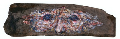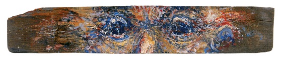 Et voici que, dans le texte de Sartre, le passage où les yeux s’ouvrent, où le regard paraît, engendre des regards colorés, peints sur bois, comme de grands « loups » enthousiastes (au sens étymologique ?), des regards mis en majesté, qui donnent « Quatre trous/Regard XV » (2000), « Regard III » (2000), et « L’Etoile/regard XVIII » (2005)