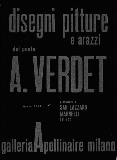 Alexandre de la Salle – Quand on suit à la trace le parcours d’André Verdet, on tombe sur des petits trésors archéologiques, des livres-objets, des livres-poèmes, avec des matières recherchées, des sérigraphiées… Le « noir » si étrange, mais si bien vu, de « Provence Noire » (1955), on le retrouve dans la publication de la Galerie Apollinaire de Milan, intitulée « disegni pitture e arazzi del poeta A.Verdet » (marzo 1959), prefazioni di San Lazzaro, Magneli, Le Noci, où la photo d’André a été faite par Hans Hartung.