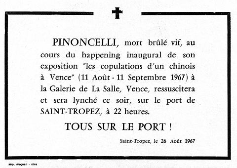 En fait, dix jours après la lettre que je viens de citer, le 13 octobre 1966, Pinoncelli faisait un happening à l’Autodrome Massol et au restaurant la Coupole, intitulé « La main noire sur ma figure, comme un cancer » avec Michel Ragon. Le 17 janvier 1967, c’était « L’Homme-Bleu IKB » ou « L’hommage à Yves Klein » au Jewish Museum, New-York. Le 15 avril 1967, au Ranch de Raoul Gonzalès, Chihuahua City, au Mexique, c’était « Agonie pour un Tarahumara ». Le 11 août 1967, c’était chez moi, place Godeau « Dédoublement-Copulation-Bûcher », et le 26 août, faisant partie de mon expo, sur le port, en face de Sénéquier à Saint-Tropez, c’était « Lynchage et spasmes pour un double », avec la participation de Farhi et moi. « La police a d’abord mutilé puis brutalement interdit ce happening », écrit Pierre dans sa plaquette sur le happening. Et le 25 décembre ce sera, sur le trottoir face aux Galeries Lafayette à Nice : « Maman ! Le Père-Noël est devenu fou, il casse tous ses jouets ! »