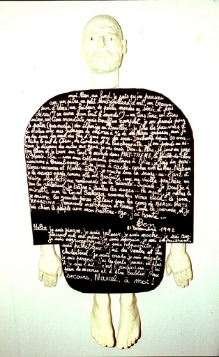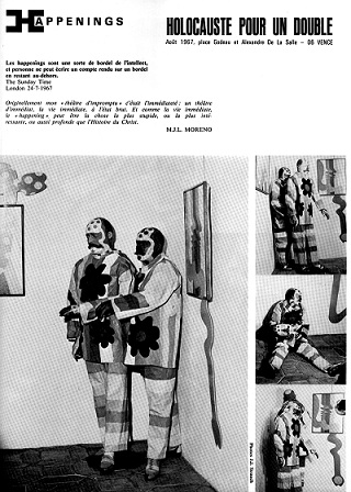 Homme Tableau, comme il y a les Hommes Sandwich et les Hommes Livres de Farhenheit... peinture ambulante, libre, dehors, dans les rues, à la mer, sur un coin de trottoir, aux sports d’hiver, dans un urinoir public, comme un arc en ciel de pissotière... perchoir caméléon pour des mouettes en papier... épouvantail à vieillard... instant de carnaval... morceau de folie en technicolor ... flaque de vie bariolée... oriflamme aux teintes de l’enfance... confiture de clown... pantin aux couleurs de mescaline... piège à lumière ... coloris du spectre... homme de couleur de race blanche ... mannequin articulé pour safari humain... soleil monté sur jambes et que suivaient les enfants, car il avait la couleur de leurs jouets ... tas de couleurs à tête de masque... ma tête de mort en sucre d’orge que j’enfile le Dimanche... ma tête des Tropiques, celle qu’on ne réduira jamais... » (Pierre Pinoncelli, Nice, 15 février 1968)