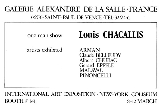Alexandre de la Salle – Oui, il m’écrit de Nouillorque le samedi 10 mars : « Merci pour ta dernière lettre… Quel cirque cette école de Nice ! Tu en vois de toutes les couleurs … (c’est normal avec des peintres !) J’espère que tout s’est bien terminé ? tu as envoyé le catalogue ? Je sais qu’Arman arrive demain » etc.