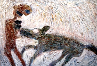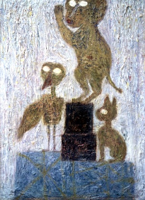 Très vite Christiane Alanore va se faire une spécialité des ébats amoureux entre homme et femme, aussi bien dans ses dessins que dans sa peinture, mais il faut noter la place des animaux dans sa mythologie. Et dans la plaquette de l’exposition chez Jeanne Castel, 3 rue du Cirque ( !) en novembre-décembre 1955, intitulée « Peintures », Fernand Gregh titre « Les animaux saisis dans leur essence et leur ridicule préhistoriques » :