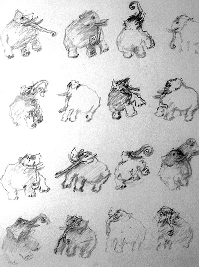 Dessins de Serge, nombreux, qui hantent le lieu, planches d’éléphants alignés dans la diversité de positions joueuses. Esquissés et pourtant habités d’intenses mouvements retenus. Masses de vie, quoique toujours en effleurement : là est l’ambiguïté de son travail. Chevaux et cavaliers amoncelés, noirs et blancs aux reliefs veloutés, entrelacs d’animaux, d’animés, comme métaphores du « comment chevaucher ? » Comment chevaucher la Bête dans la tempête, le chaos ?