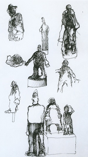 Dans le silence du Lieu, son atelier, où des marionnettes assoupies, en attente, anthropomorphes ou pas, maintiennent la magie de l’absence-présence. Derrière le miroir, une présence-absence. Inversées, comme sont inversés ici le poids et la plume, l’ombre et la lumière. Lumière noire des crayonnements ? Ombre mise à nue par ses célibataires mêmes....