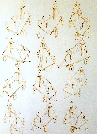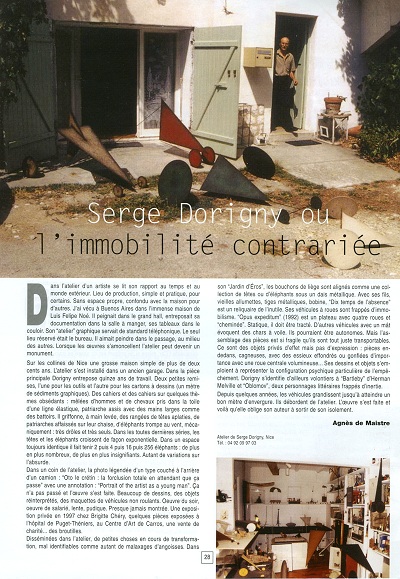 Trois périodes et encore plus de manières ne donnent pas une sensation de décousu, d’inconstance. Car les figures envisagées, le cheval puis le char, la monture puis le véhicule, inséparables du destin du cavalier et du conducteur, traitent de la dialectique particulière du psychisme et du mental. Qu’il y ait entre eux conflit et la course entreprise peut mener à la folie et à la mort ; qu’il y ait accord, elle se fait triomphale. Chez Dorigny, ni l’un ni l’autre. Ni conflit, ni accord mais une adhérence qui neutralise. Souvent le char est seul sans conduite ni attelage. L’ensemble des forces psychiques ne sont pas dirigées par l’esprit, pas davantage livrées à elles-mêmes. Ses objets roulants ne sont pas des machines destinées à transformer l’énergie et à utiliser cette transformation. Dans ses chars, pas de machinerie. Pas de pédales et de chaînes pour entraîner les roues ni de moteur. « Opus expeditum » (1992) est un plateau avec quatre roues et « cheminée ». Statique, il doit être tracté. D’autres véhicules avec un mât évoquent des chars à voile. Ils pourraient être autonomes. Mais l’assemblage des pièces est si fragile qu’ils sont tout juste transportables. Ce sont des objets privés d’effet mais pas d’expression : pièces en dedans, cagneuses, avec des essieux effondrés, gonflées d’importance avec une roue centrale volumineuse... Un char, plus grand que les autres est « conduit ». Face aux mouvements ardents ou désordonnés des chevaux que sont en nous nos instincts ou nos passions, l’aurige est la raison à la fois souple, adaptée, vigilante et inflexible. La main qui tient les rênes représente parfaitement le nœud qui relie les forces de l’esprit et celles de la matière. L’aurige de Dorigny est en presque lévitation au-dessus d’un char incapable de mouvement. Les rênes traversent les mains percées de l’homme oiseau cruciforme. Contrôlant et contrôlé par un véhicule immobile. Passions et raison se neutralisent. Lectures, influences formelles, interrogations diverses, rien n’y fait : Serge Dorigny n’est pas dans la dialectique de l’histoire de l’art. Ses dessins et objets s’emploient à représenter une configuration particulière de la psyché, l’empêchement. Non pas le mal vivre mais le non-vivre. Et cette œuvre ironique et souvent franchement drôle distille une pernicieuse tristesse. (Agnès de Maistre)