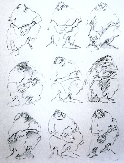 Doté d’une formation secondaire en ajustage et dessin industriel, Serge Dorigny entre dans la vie active à dix neuf ans : tireur de plans aux Ponts et Chaussées. Parallèlement, en autodidacte, il dessine à la plume, au crayon noir ou de couleurs. Beaucoup. Des cahiers et des cahiers sur quelques thèmes obsédants : mêlées d’hommes et de chevaux, pris dans la toile d’une ligne élastique, patriarche assis avec, posées sur les genoux, des mains larges comme des battoirs. Les différentes influences, avouées au delà du raisonnable (Picasso, J. Villon mais aussi Klee, Wols, Balthus, les surréalistes) servent de variations stylistiques. Six ans passent avant qu’il ne revienne à ses obsessions graphiques : homme debout, visage et mains puissantes noircis par un écheveau de traits de plume. Dorigny s’évade à nouveau pour quatorze ans.