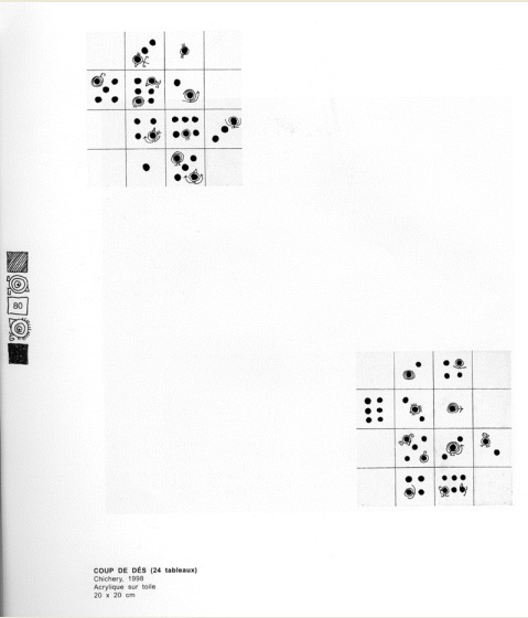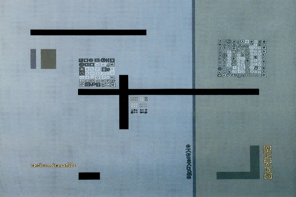 Aujourd’hui, c’est une orchestration de signes qui s’établit dans un espace aux éléments rigoureux. Une sorte de vocabulaire ésotérique inter¬fère avec des groupes de points ou de petits carrés disposés selon un ordre préétabli.