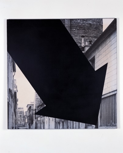 Sur des toiles représentant des paysages, des feuillages, ou sur des reproductions d’œuvres, il pose ses objets oblitérants : cadres, cibles, chiffres, etc., un vocabulaire graphique toujours renouvelé.