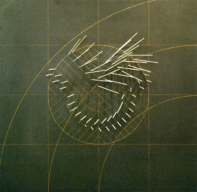 L’artiste part d’une forme polygonale plate et en superpose une deuxième égale qu’il fait vibrer en créant une distance entre les deux figures, traversées par des vecteurs directionnels. Création, donc, d’un espace chargé de la mémoire du mouvement. Grâce à une œuvre de 1978, qui se trouve dans l’exposition, nous pouvons voir comment jaillit et se développe la procédure de Pinna qui le mène à traverser deux dimensions en intégrant un espace « vide » à l’intérieur de l’œuvre.