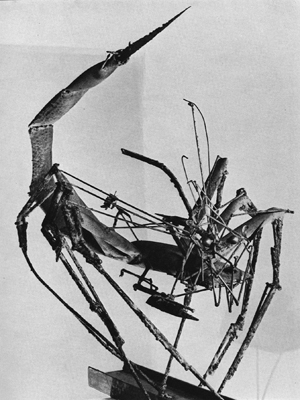 L’idée de faire des sculptures en métal forgé, artistiquement valables, revient probablement à l’espagnol Pablo Gargallo (1881 1934). Se dégageant du métal ouvré style art nouveau, il exécuta le premier, entre 1914 et 1920, plusieurs masques en cuivre et en fer martelés, traités comme des bas reliefs, et après 1924, des figures à trois dimensions toujours selon le même procédé. Mais ses méthodes de travail étaient celles du forgeron, et il fut dés¬avantagé par certaines difficultés provenant du matériau utilisé ; le métal, par exemple, a tendance à prendre des formes gauches et il est rebelle à se laisser modeler en rond. Mais Gargallo avait l’esprit inventif. Il imagina très vite une manière de juxtaposer des surfaces convexes et concaves qui évoqueraient des volumes, perçant et découpant les surfaces pour que surgissent différents plans ; une structure ajourée et des contours nettement découpés soulignaient les formes et accentuaient le rythme de leurs proportions. Malgré l’invention déployée, l’œuvre de Cargallo garde pourtant un aspect artisanal. Avec l’œuvre de son com¬patriote Julio Gonzalez (1876 1942), lui même fils d’un métallurgiste, cette faiblesse disparut. En 1928, Gonzalez commença ses premières sculptures en métal. Il introduisit peu après la technique de la soudure dans la sculpture qui ouvrait au sculpteur un plus grand champ de possibilités. Le métal chauffé au chalumeau devenait malléable et plus maniable. On pouvait alors joindre des pièces qui autre¬ment auraient été inassociables. Gonzalez ne fut cependant qu’un intermédiaire. Il fit progresser la technique, il ne l’exploita pas. Son vieil ami Picasso profita de son enseignement et alla de l’avant ; il eut non seulement des idées révolutionnaires, mais donna une série de réalisations spectaculaires. Picasso tâtonnait depuis 1928 sur une nouvelle expression sculpturale. Il peignait et dessinait à cette époque des figures dans l’espace employant les lignes de manière à suggérer des échafaudages filiformes. En 1930, il comprit qu’il pouvait traduire littéralement en trois dimensions ces espèces de diagrammes picturaux. Il souda des barres de métal et produisit des constructions linéaires où le vide reste apparent. Difficiles à interpréter avec exactitude, ces sculptures n’en laissent pas moins dans l’esprit une nette impression figurative. En 1931 32, il abandonna cette manière de dessin dans l’espace pour une conception sculpturale plus aventureuse. En soudant les éléments métalliques les plus disparates en une construction insolite, il créait une image nettement figurative. Dans ces sculptures, Picasso exploitait une technique nouvelle. Il utilisa des ready made, d’humbles matériaux que par la création artistique il métamorphosa en des œuvres hautement significatives.