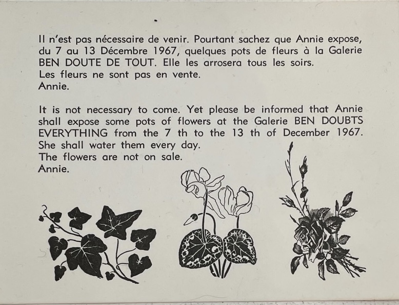 Si Benoît Barbagli se pare d’une barbe fleurie de mimosa et Natacha Lesueur d’une rose admirablement composée de tranches de jambon cru, Annie Vautier expose quelques pots de fleurs « qu’elle arrose tous les soirs » (reprise d’une performance faite en 1967), le geste le plus simple, le plus impliqué et le plus poétique d’une relation intime établie avec le végétal.