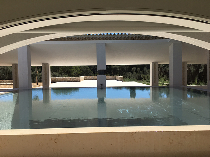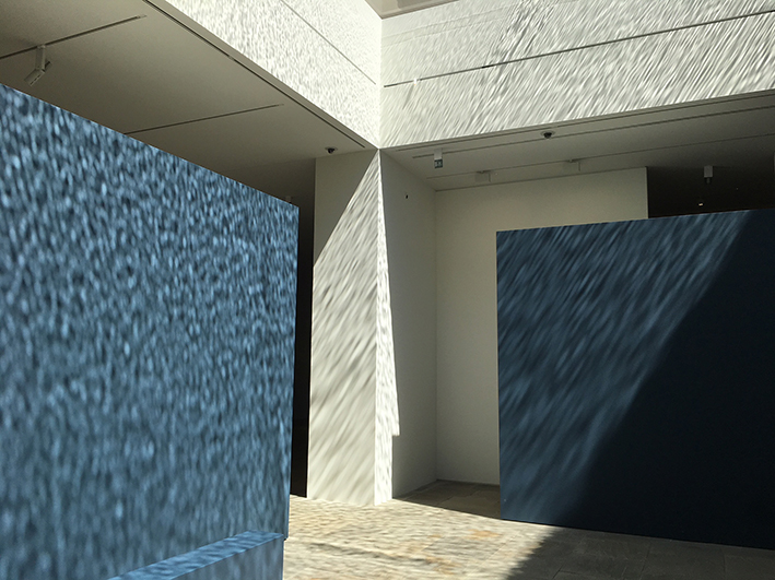 Autour d’un puits de lumière sous forme de plafond de verre où des eaux mouvantes circulent, se reflétant sur les murs.