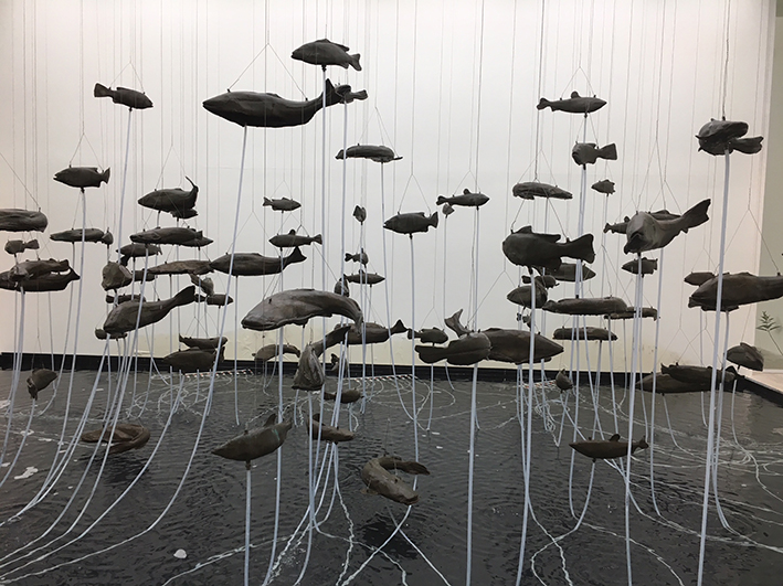 Quelques belles installations ou sculptures monumentales ponctuent le parcours : Cent poissons de Bruce Nauman, un bel escalier dominé de cerfs volants de Jacob Hashimoto...).