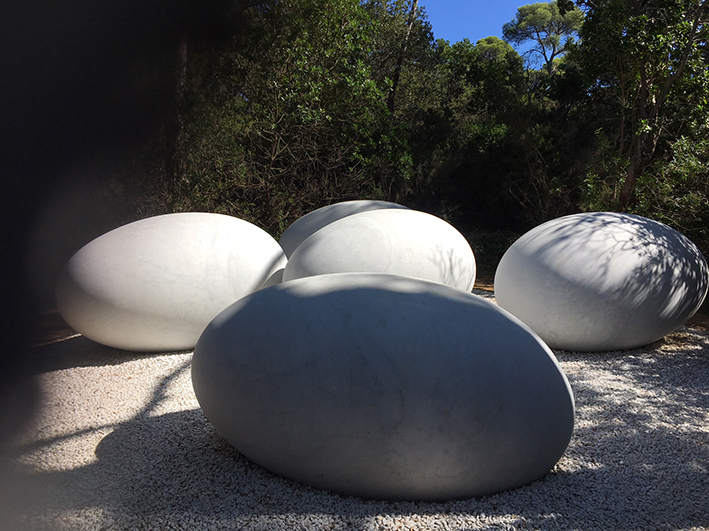 A l’extérieur, une sculpture de Miquel Barcelo ?, l’Alycastre, le dragon le ?gendaire de Porquerolles, nous accueille à l’entrée, et dans les jardins alentours, entre les pins, les cistes et les oliviers sont installées de nombreuses d’œuvres qui dialoguent entre elles : labyrinthe de miroirs de Juppé Hein, les œufs géants de Nils Udo, les très intéressants visages taillées au burin et au marteau-piqueur sur les façades d’une petite maison (de Alexandre Farto Aka Vhils), les belles têtes d’alchimiste de Jaume Plensa, etc.