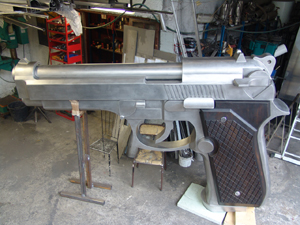 Philippe Perrin. Pour cet artiste, issu de la Villa Arson qui se nourrit exclusivement d’extraordinaire, JLB réalisera plusieurs objets surdimensionnés dont 4 poignards, un revolver Beretta en acier long de 3 mètres et plus récemment une couronne de christ de 3,60 mètres de diamètre exposée en l’église Saint Eustache à Paris. Aujourd’hui c’est un gigantesque chapelet qui est en gestation dans les ateliers : « J’ai tout de suite été fasciné par l’univers décalé de ce plasticien qui eut le culot d’exposer dans la vitrine d’une banque le matériel d’un casse ».