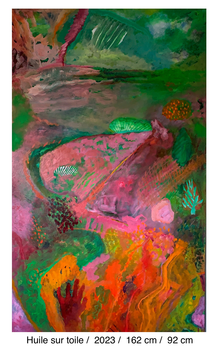 Défiant la gravité, ses formes colorées, continues ou discontinues, s’intriquent entre elles, se fondent les unes dans les autres, et s’enchevêtrent dans des univers aux limites de l’aérien et de la fluidité liquide. Elles ne semblent plus liées à une pesanteur ni à un horizon et révèlent des paysages imaginaires à la limite de la figuration.