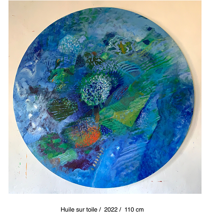 Des toiles aux couleurs à la fois vives et tendres évoquent des paysages terrestres, d’autres nous plongent dans des ciels inconnus où des maelströms de couleur se manifestent dans différents espaces du tableau.