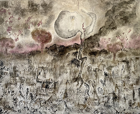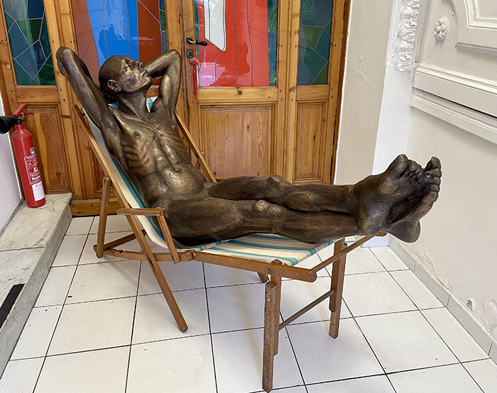 À l’entrée, la sculpture à taille humaine d’un homme allongé sur un transat de Nicolas Lavarenne nous accueille, une image de détente, de sérénité. Il est entouré des paysages poético-tourmentées d’Sylvia Leone-Castaldi où un arbre-embryon s’élève vers le ciel pendant qu’une humanité lasse peuple la terre.