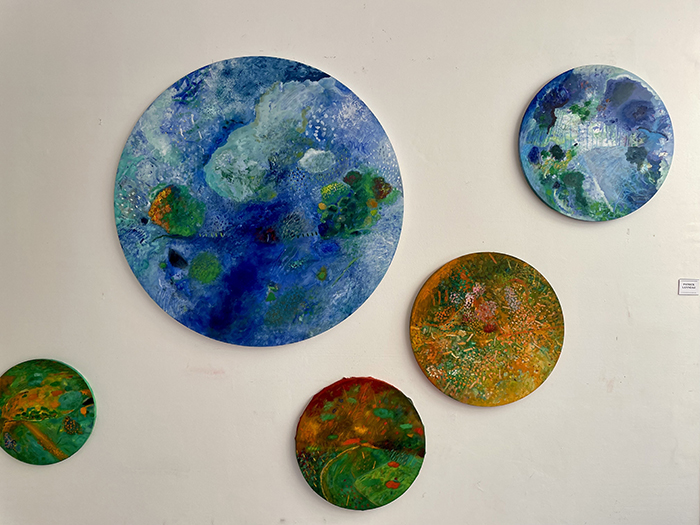 Plus loin, Patrick Lanneau, présente six astres-sphères où les couleurs se semblent se mouvoir et se mêler, formant des paysages fluides à la limite de la figuration. Ils font face aux fins fils de fer de Béatrice de Domenico qui dessinent des arbres danseurs et côtoient les sculptures de Paolo Bosi qui mêlent esthétiquement terre et bois en jouant avec la lumière.