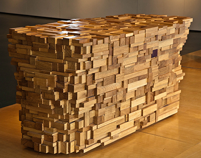 À l’image des constructeurs médiévaux, il se sert des chutes et des tombés de bois et utilise jusqu’aux copeaux et sciures qu’il agglomère, fabriquant ainsi de nouvelles planches qui deviennent œuvres d’art (les « MOC »). A partir de 1995 il développe un nouveau concept : « La Marqueterie Massive » qu’il utilisera dans la conception de mobiliers pièces uniques et de sculptures (voir photos).