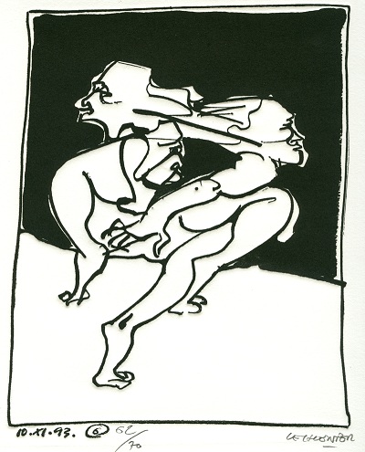 Qu’y a t il entre elle et lui ? Un savoir. Sur l’abîme. Sur le « RIEN » qu’évoque Henry. C’est le Nada nada nada de Saint Jean de la Croix. Lui aussi, Henry, « sait », de cette manière. C’est pourquoi il parle de marginalisation de toute idée directement liée au thème. Et c’est aussi pourquoi Jésus a pu s’inviter dans sa peinture actuelle, s’infiltrer dans ses graffiti, dans ces graphismes du « délire », au sens de la sortie du sillon. Hors dogme, Jésus le Marginal a pu naître de ces dessins préparatoires non guidés par le conscient. Le royaume, il est le dedans et le dehors de vous.