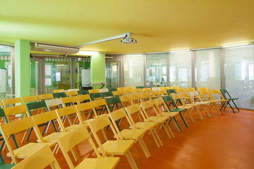 Il y a plusieurs pièces dans ce lieu : une cuisine, une bibliothèque, des bureaux, un auditorium…