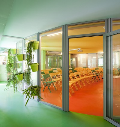 Le point commun avec le HI hotel est de déplacer les codes. Un espace bureau est normalement très codifié. On propose ici d’apporter autre chose, à commencer par l’espace de séminaire (l’auditorium) qui est un espace rond. C’est comme une serre, avec des fonctions tout autour, l’idée étant de partager, de vivre ensemble. C’est d’ailleurs le cœur des projets au HI.