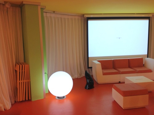 On a aussi un auditorium qui est fait pour regarder des films, puisqu’on ne veut pas qu’il y ait de télévisions dans les chambres (on ne vient pas en Tunisie pour regarder la télé… !). Un dispositif de chaises longues avec coussins s’y trouve, que l’on peut ôter dans la journée, pour transformer cette pièce et la rendre vraiment hermétique pour en faire une salle de réunion.
