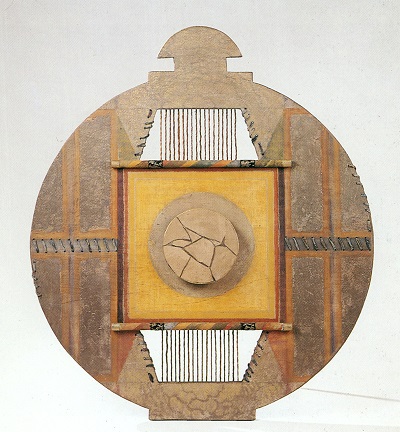 Une culture a pour conséquence un désir d’approfondir et, si l’on est créateur, un souci d’identification à des antériorités spirituelles. Les c1oîtres romans ou les temples génèrent les motets et les mandalas. L’appréciation de la délicate métrique de du Bellay ou l’écoute des dodécaphonistes constituent au même titre notre richesse et notre liberté mentale. Ce substrat est indispensable dans sa diversité à toute prospective. La culture ne saurait se différencier, elle forme un tout. Une œuvre serait elle possible sans culture ? Ainsi les « Tampuras » de JANI contemplés pour la première fois en cet après-midi d’Avril m’ont ils plongé dans une spiritualité inhérente à la culture. Certes je connaissais les œuvres de JANI, les incitations à l’onirisme de certaines de ses toiles, son attrait pour le symbolisme des mandalas et des traditions extra européennes et puis ses goûts pour certaines musiques, pour des instruments venus d’autres continents... Mais jamais je n’eusse imaginé ce bond culturel, cette envolée artistique, ce raffinement à la limite de l’histoire et du rêve que suggère un « Tampura » ... Ces instruments de musique imaginaires sont constitués de caisses de résonance circulaires, centralement ajourées autour d’un autre cercle ou d’un ensemble de cordes, voire d’un objet mythique. Les cordes sont d’ailleurs omniprésentes, avec des variations de disposition et des projections d’ombres sur le mur de support, elles sont le symbole de la création musicale. Des couleurs sourdes et denses, des fragments de peau, des textures frottées, agrémentées de collages angulaires ou parallèles créent sur ces structures des climats de légende et de modernité, tant par le rappel d’hypothétiques réminiscences que par l’émulsion neuve des pigmentations.