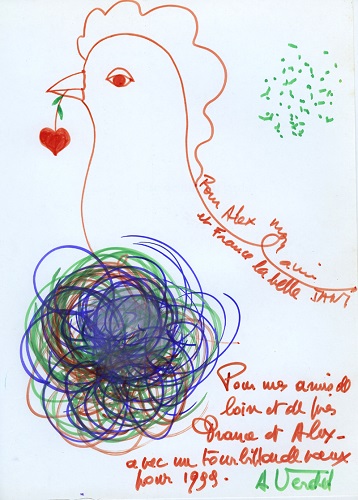 Le centenaire de naissance d’André Verdet tombe très bien pour parler de l’amitié Jani/André Verdet, avec complicité artistique puisque, en dehors du fait que lui ait beaucoup écrit sur son travail à elle, André demanda à Jani d’illustrer son texte « Fête de nuit au jardin », pour les éditions de « L’Ormaie » en 1998. Le talent d’André pour les contes est connu, et les amis de Jani savent combien de dessins féériques elle peut envoyer comme cartes improvisées pour célébrations inattendues… La double dédicace du livre par Jani et André Verdet restant un moment béni, talisman contre la tristesse…