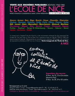 Les œuvres des artistes ayant participé historiquement ou ponctuellement au mouvement de l’École de Nice ont été visibles à Paris, le 22, 23 et 24 Octobre, chez Marc Ottavi (Expert à Paris et pour la vente de l’École de Nice) et elles ont été en exposition complète à Nice, en avant-première de la vente aux enchères, le 29 et 30 Octobre.