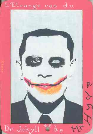 L’un des descendants de Jekyll-Hyde est le Joker apparu, en 1940, dans le premier numéro de Batman dessiné par Bob Kane. Tombé dans une cuve de déchets chimiques, il en ressort défiguré, avec deux cicatrices qui prolongeront sa bouche d’une oreille à l’autre. Il en fera le symbole de son exécration du genre humain en la rehaussant de rouge à lèvres pour mener le combat du mal contre le bien, incarné par son meilleur ennemi, l’homme chauve-souris. Il est symptomatique que les identitaires américains du mouvement Tea Party aient cru déceler Barak Obama sous le masque du sinistre clown blanc qu’est le Joker. Ainsi reproduit sur leurs tee-shirts, il révèle la dangereuse dualité du président. Doux et gentil à l’extérieur, odieux et sournois à l’intérieur. Elégant, instruit, brillant, bien sous tout rapport. Mais démocrate et libéral : l’incarnation du mal américain absolu. Dr. Jekyll et Mr Hyde.
